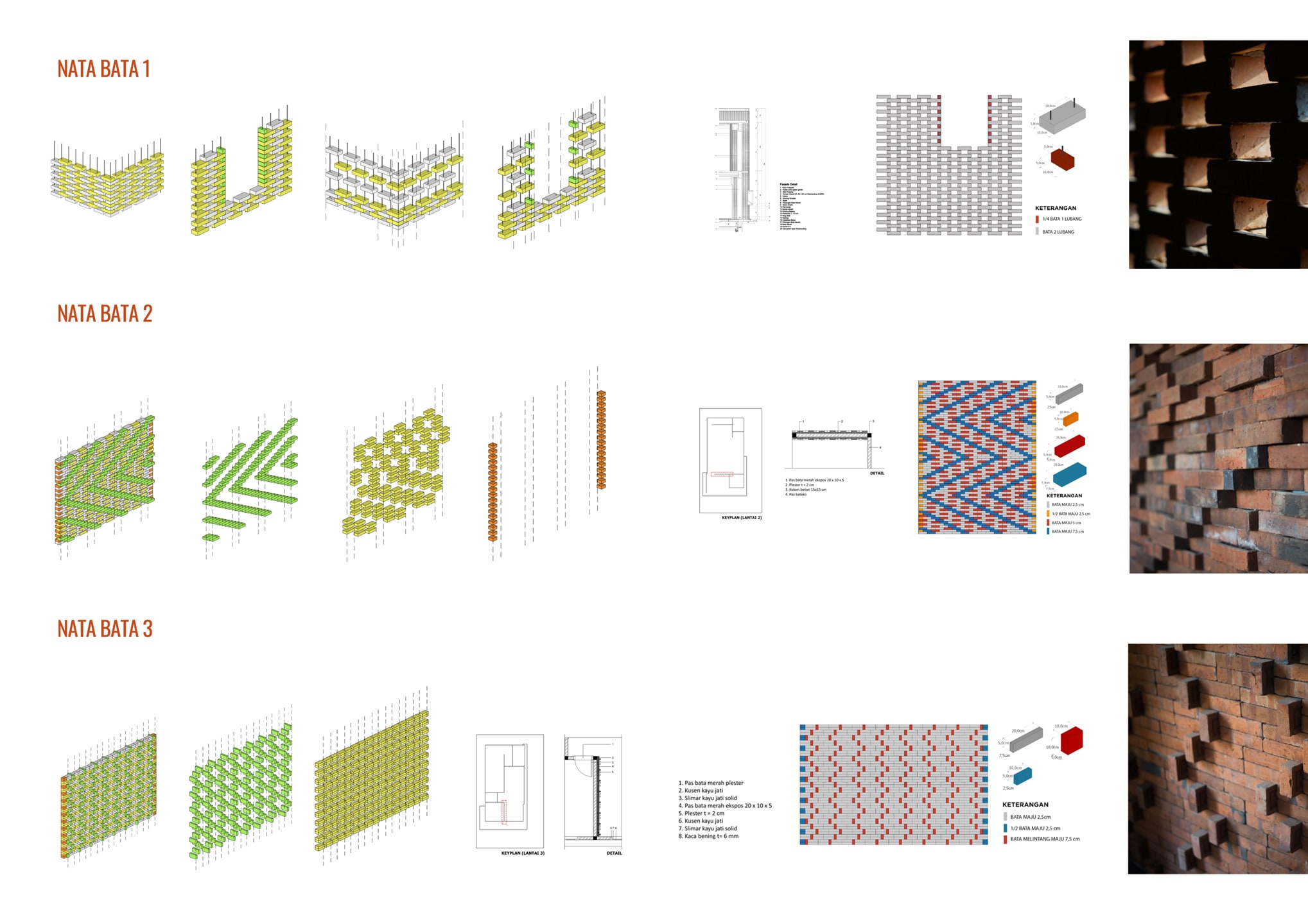 라흐만: 우리가 보토 주택에서 보여주고 싶었던 또다른 주제는 방금 말한 수공예의 장인정신과 벽돌이라는 재료 자체였다. 우리는 우리의 프로젝트와 사무소가 위치한 자바 동부 지역에서 14세기 마자파 힛(Majapahit) 시대부터 사용되어온 전통적인 조적 건축을 보전하려 했다. 자바 동부의 벽돌 품질은 이미 세계적으로도 잘 알려져 있다. 보토 주택은 마자파 힛 시대에 지어진 사원들과 가까운 곳에 위치하며, 수무르 사원(SumurTemple)과 파리 사원(Pari Temple)은 불과 4km 정도 거 리에 있다. 우리는 이 두 사원의 조적 방식에 대해 연구했다. 그러면서 열세 가지의 새로운 조적 방식을 고안했고 보토주택에 이를 적용하고 싶다는 우리 의견에 건축주도 동의했다. 주택에 사용된 장식은 벽돌, 나무, 엮은 대나무, 시멘트 타일과 같이 모두 전통적인 재료들을 이용해 만들어졌다. 우리는 궁극적으로 현대에 이르러서 점차 사라져가고 있는 수공예가들의 장인정신을 다시금 끌어올리고 지역 장인들의 명맥이 유지되도록 돕고자 했다.