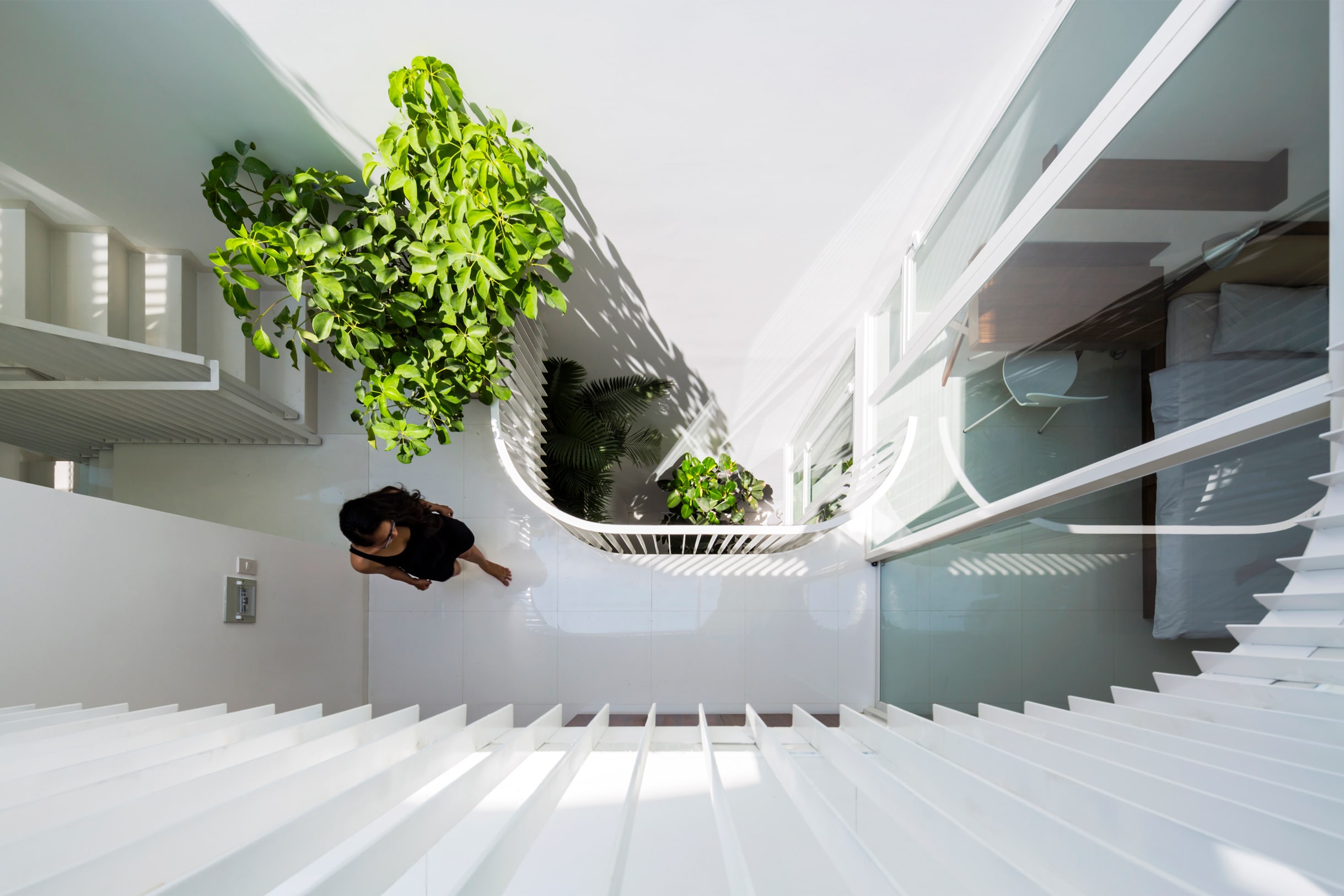 Dam: House 304 is a good example of how a space of natural ventilation and natural light can be devised in tropical climates. The key to this house, however, is the way it reconnects people and renews human-natural relationships. This spatial composition is reminiscent of a typical Vietnamese traditional house; a long, single-story structure surrounded by gardens. In a house that is open to its surroundings, residents can connect with nature in a sensitive manner. However, the quality of this space seems to be obscured by tight spaces, skyscrapers, and the need to maximize the floor area for functional purposes. The function of the void is like that found in traditional two-story townhouses in Ha N9i and H9i An. However, since House 304 is a four-story building, it had to gradually increase the size of the void for natural light to reach the bottom. In addition, the void was treated as a very important spatial component in which family members could meet visually and physically in all areas of living indoors.